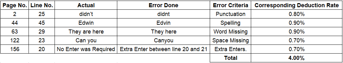 Note:- As seen in the sample accuracy report above. In the same way a report will be generated and it will be forwarded to the second party by the first party showing which mistakes are there in which line on which page number and according to the company’s method of calculating accuracy what type of error it is and hence how much % is deducted in terms of accuracy. We will send you the Error Report in 07 working days after the submission of your Workload. New Workload will be given to you after the Completion of the Given Workload.